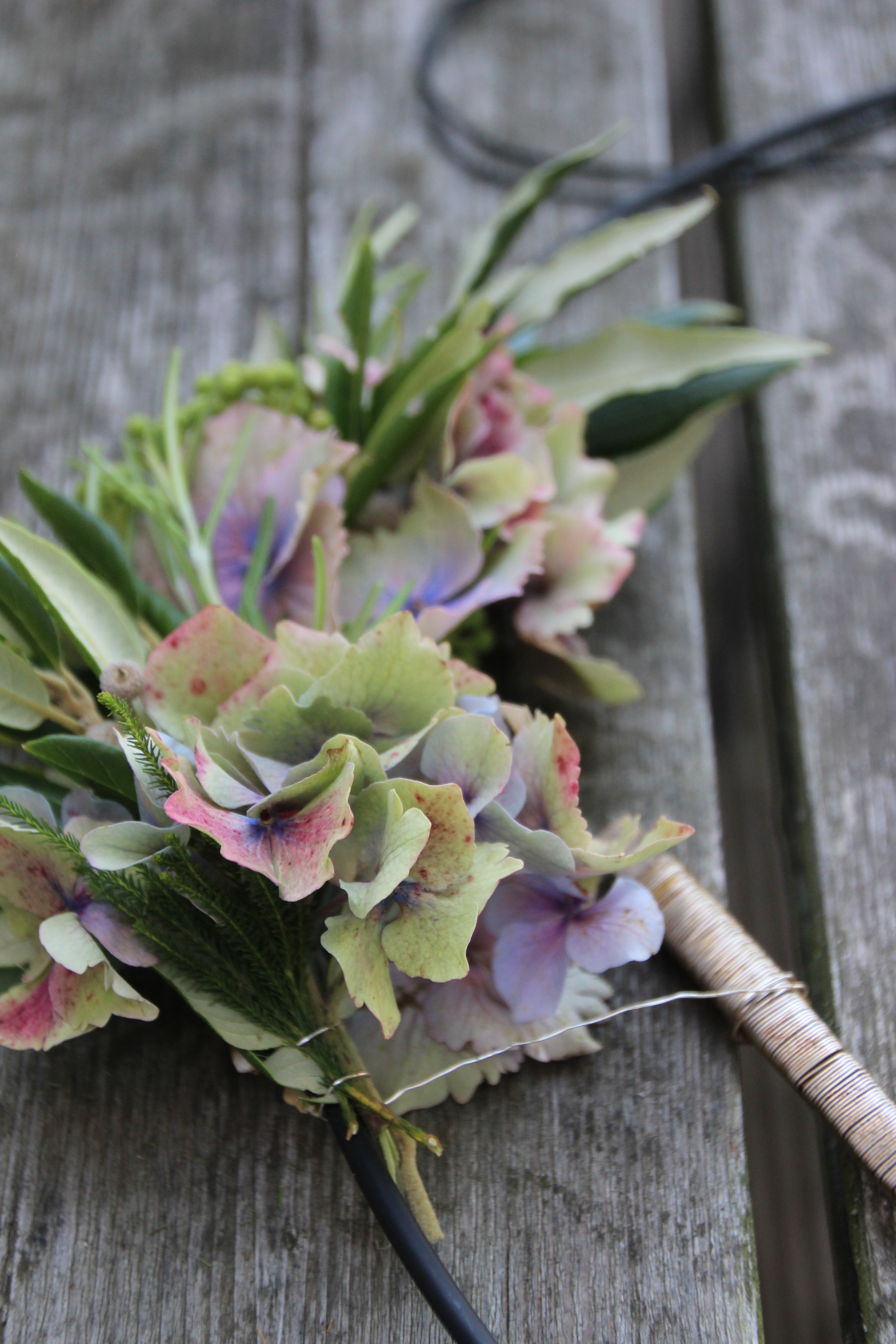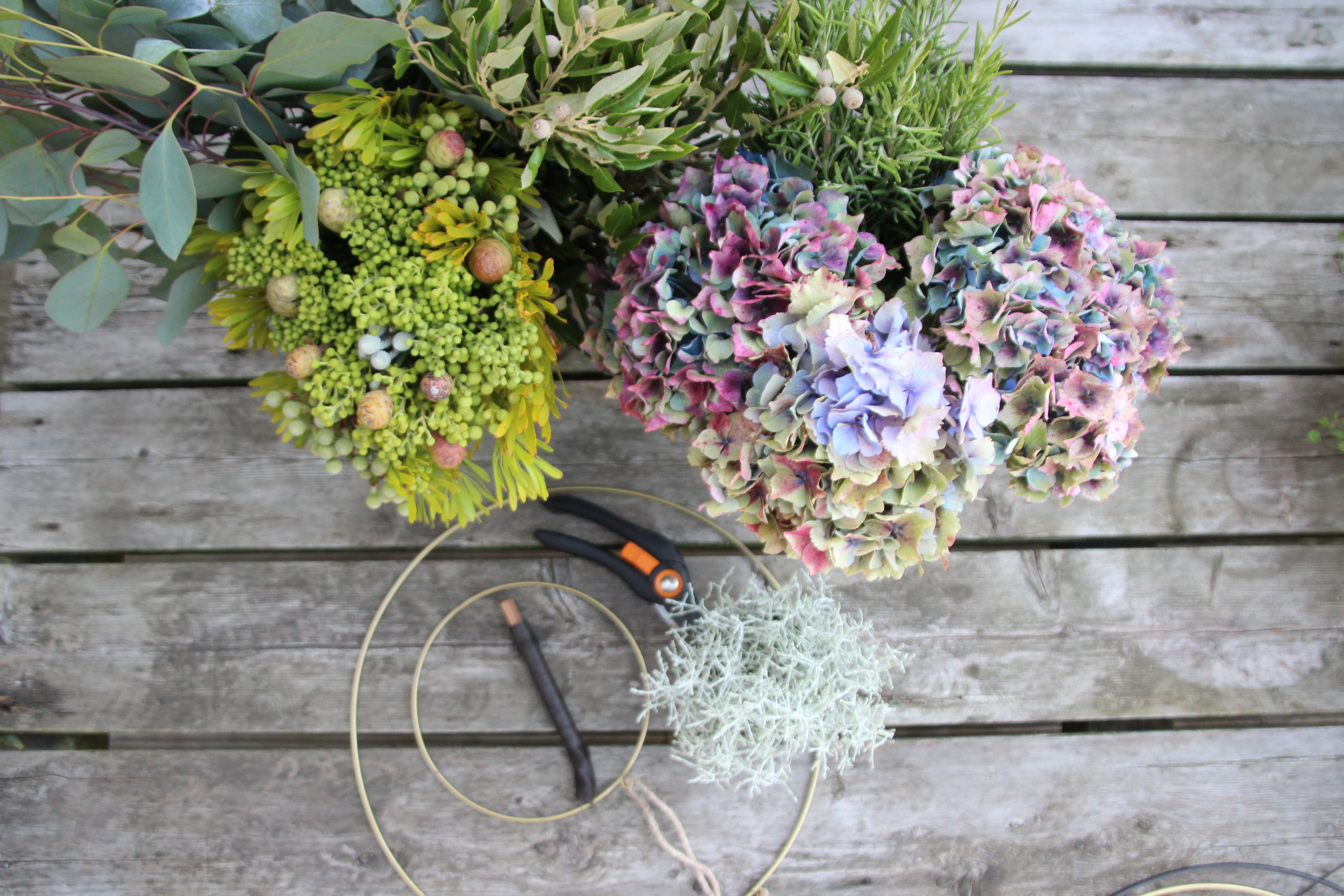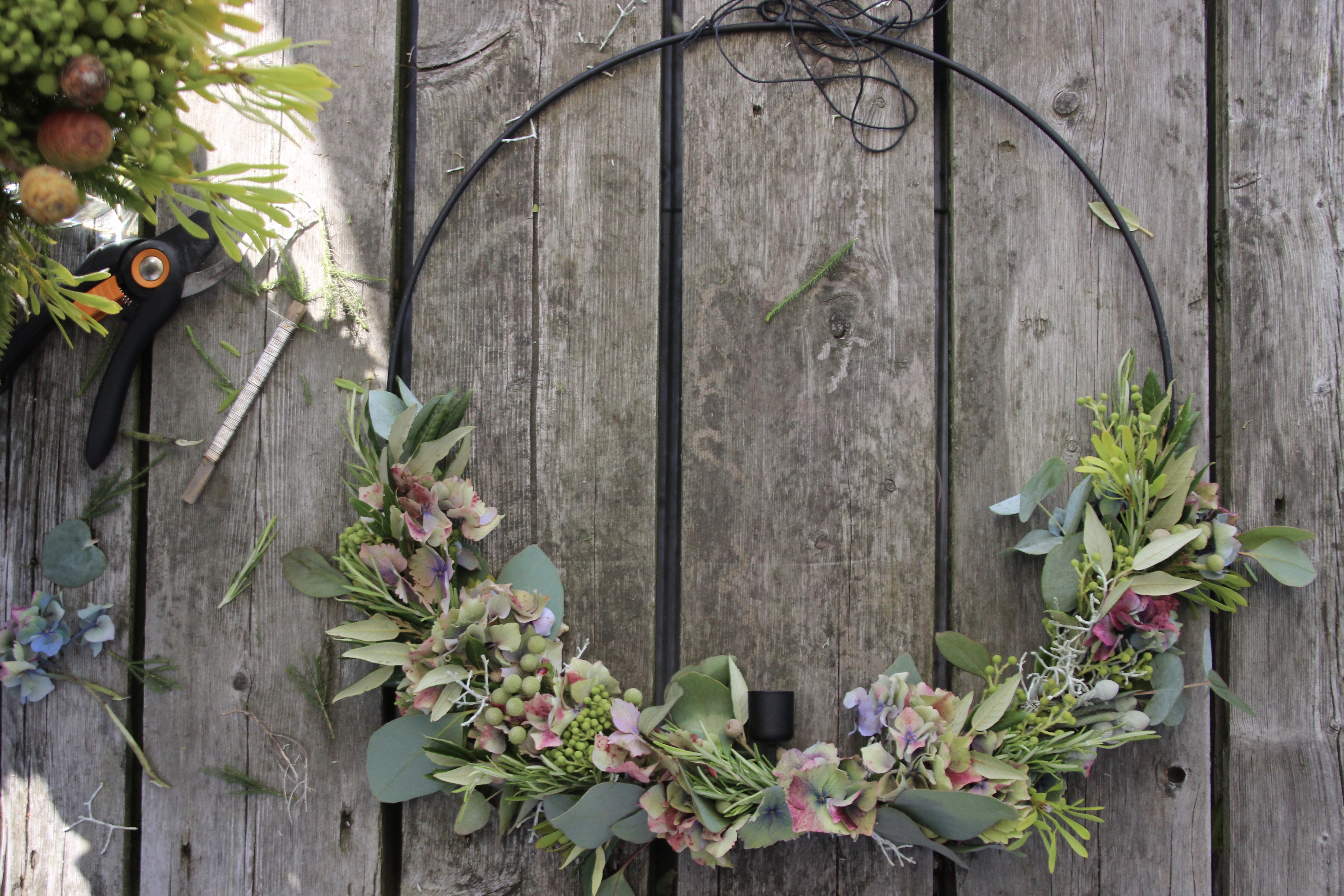 Ich habe mich für Hortensien, Rosmarin, Eukalyptus, Kapgrün, Steineiche und Silberdraht entschieden. Die Herbstzeit steht kurz vor der Tür. Da die Blumen schön Eintrocknen, habe ich also recht lange etwas von dem Kranz.