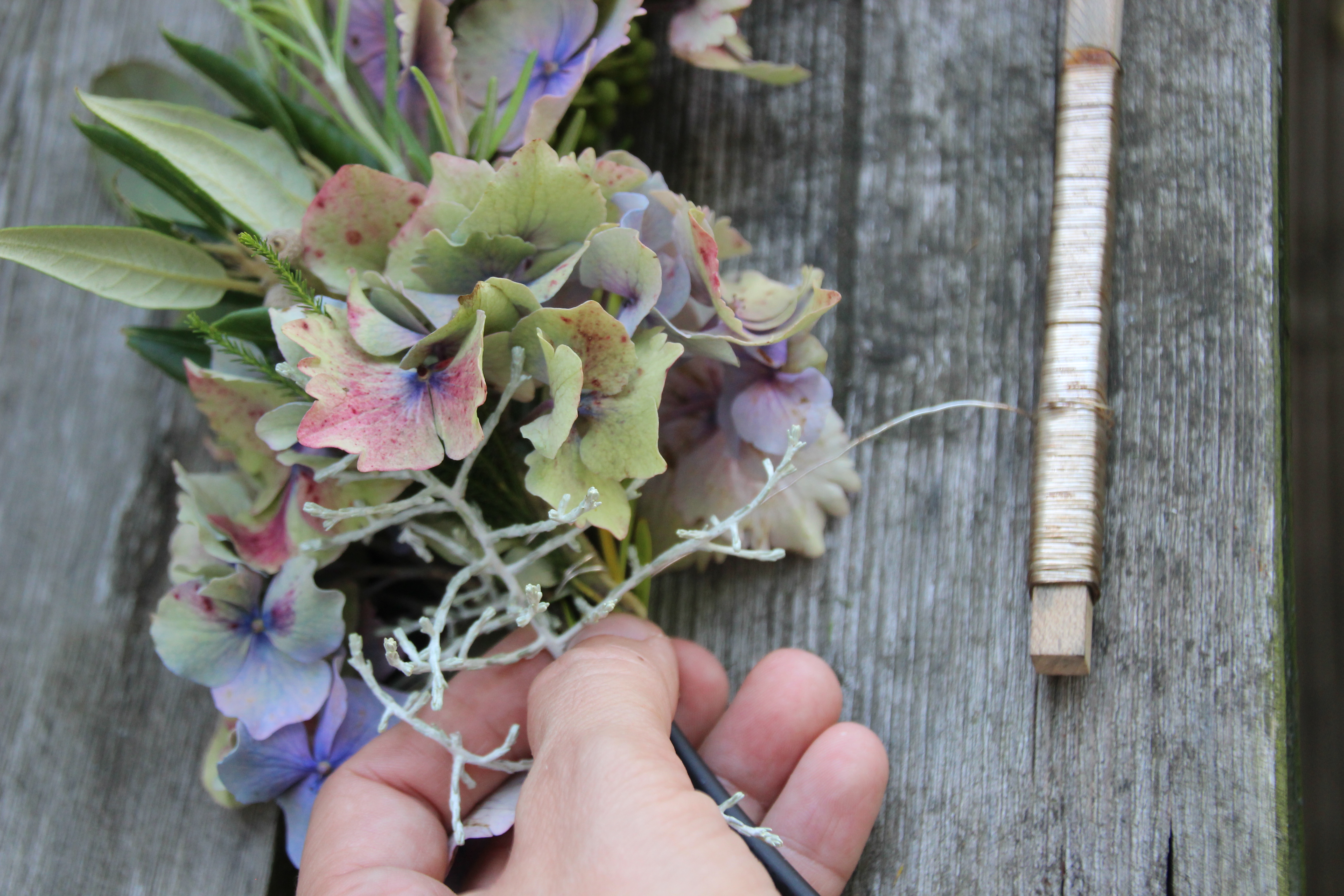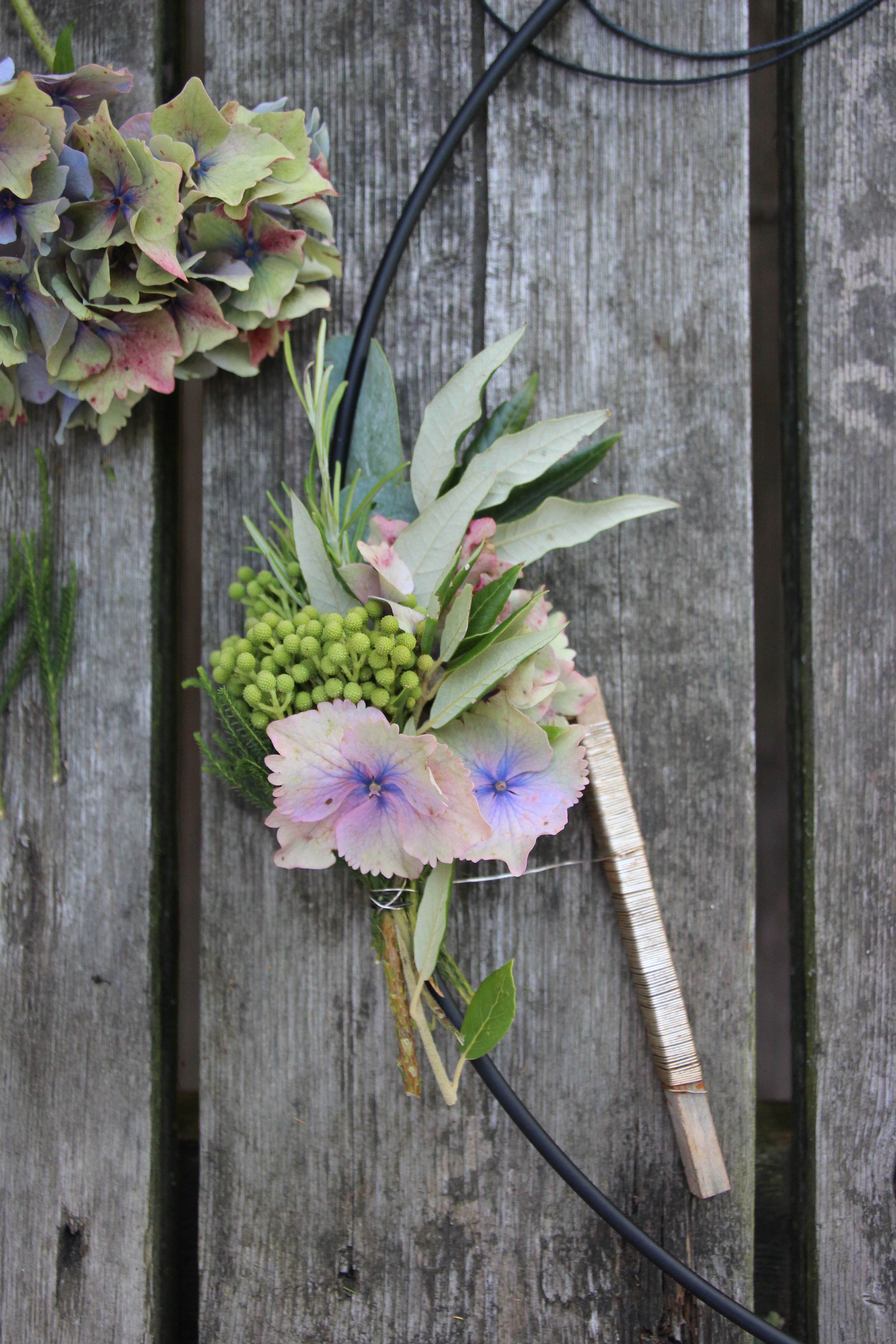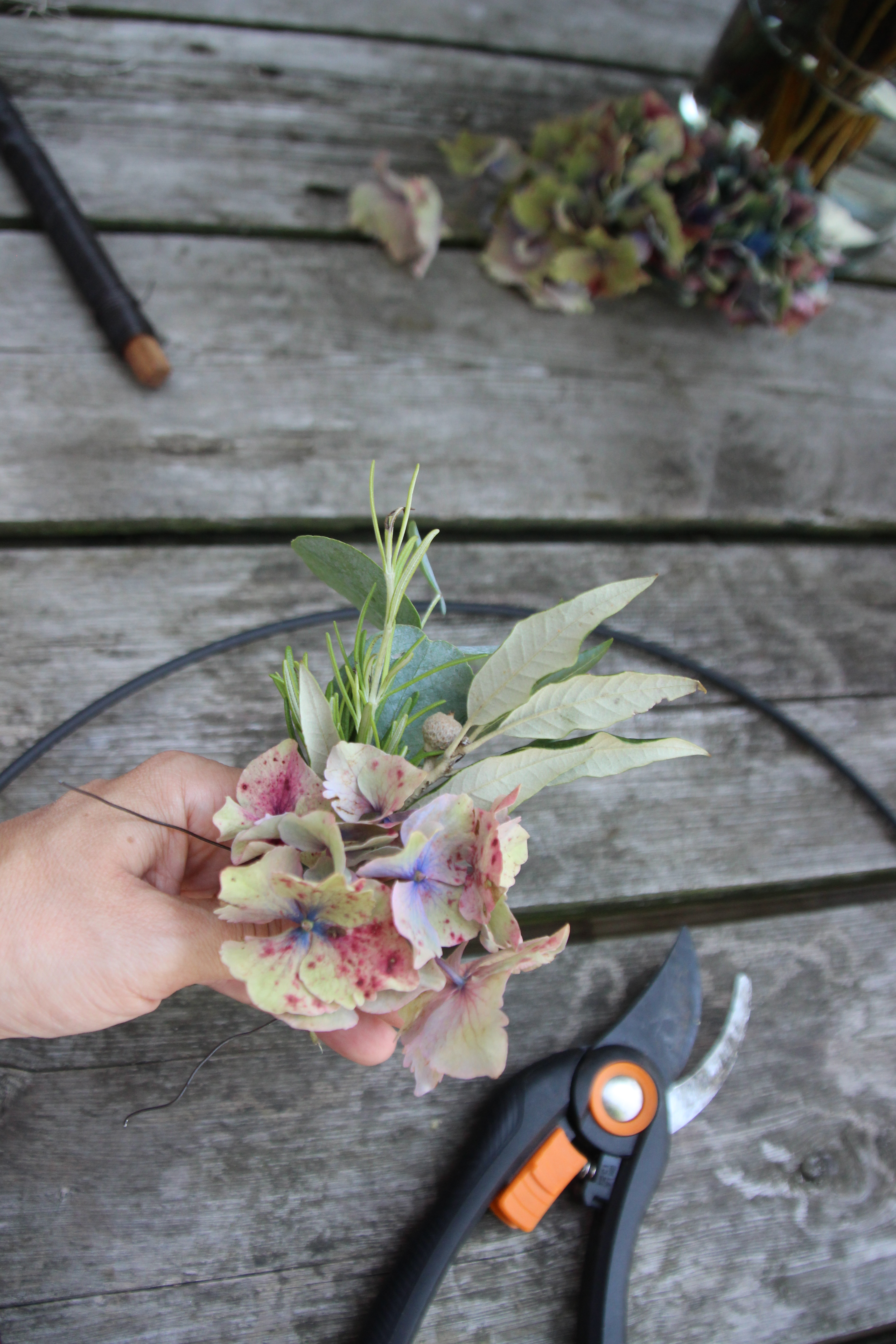Um den Anfang zu machen, habe ich mir erst einmal einen kleinen Strauß gebunden und dann am Kranz befestigt.