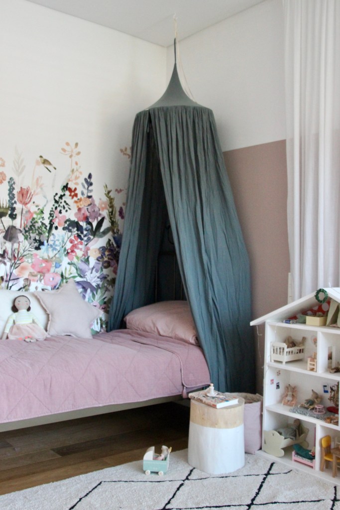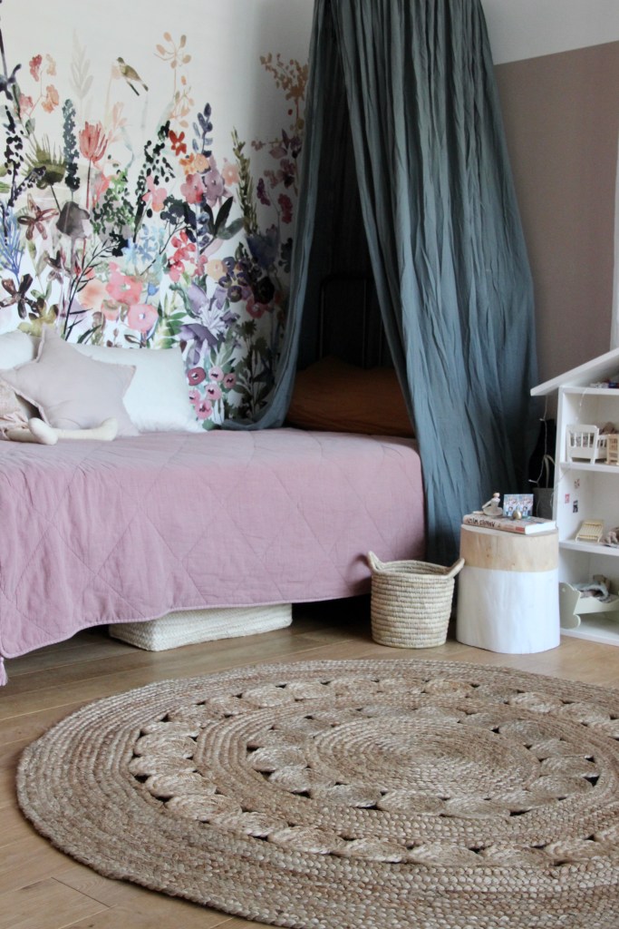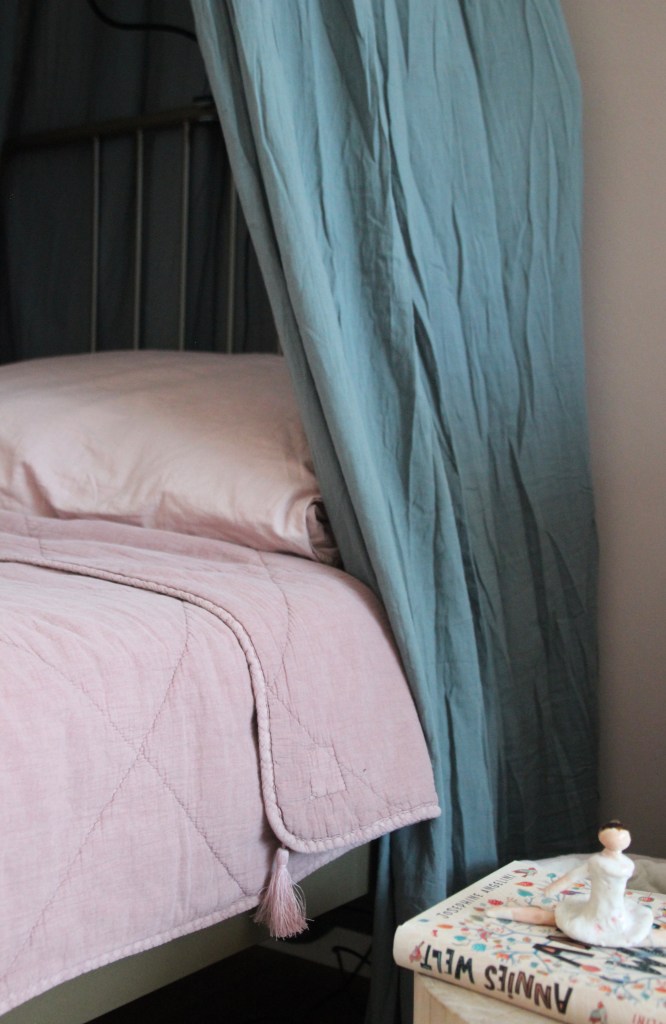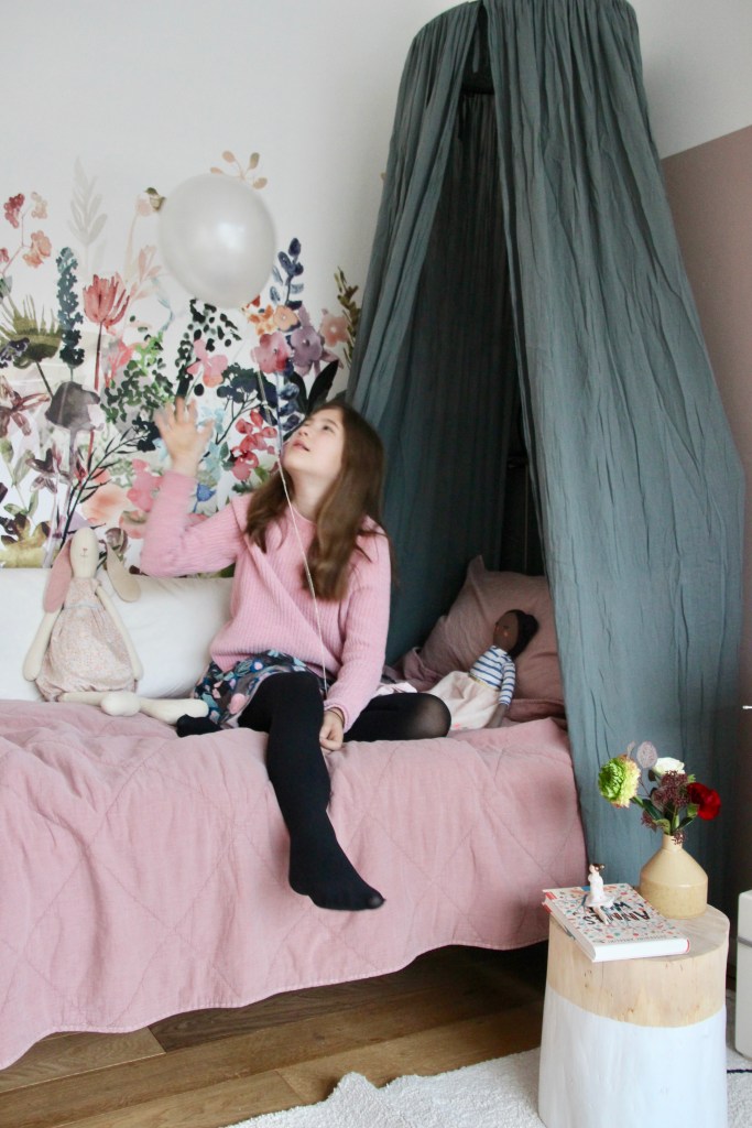 Der Betthimmel von Numero 74 , die Bettwäsche von H&M Home sowie die Tagesdecke von C’est Bon passen perfekt zur Fototapete von Rebel Walls. Bei der Wandfarbe habe ich mich für „Puder“ aus dem Bauhaus entschieden.