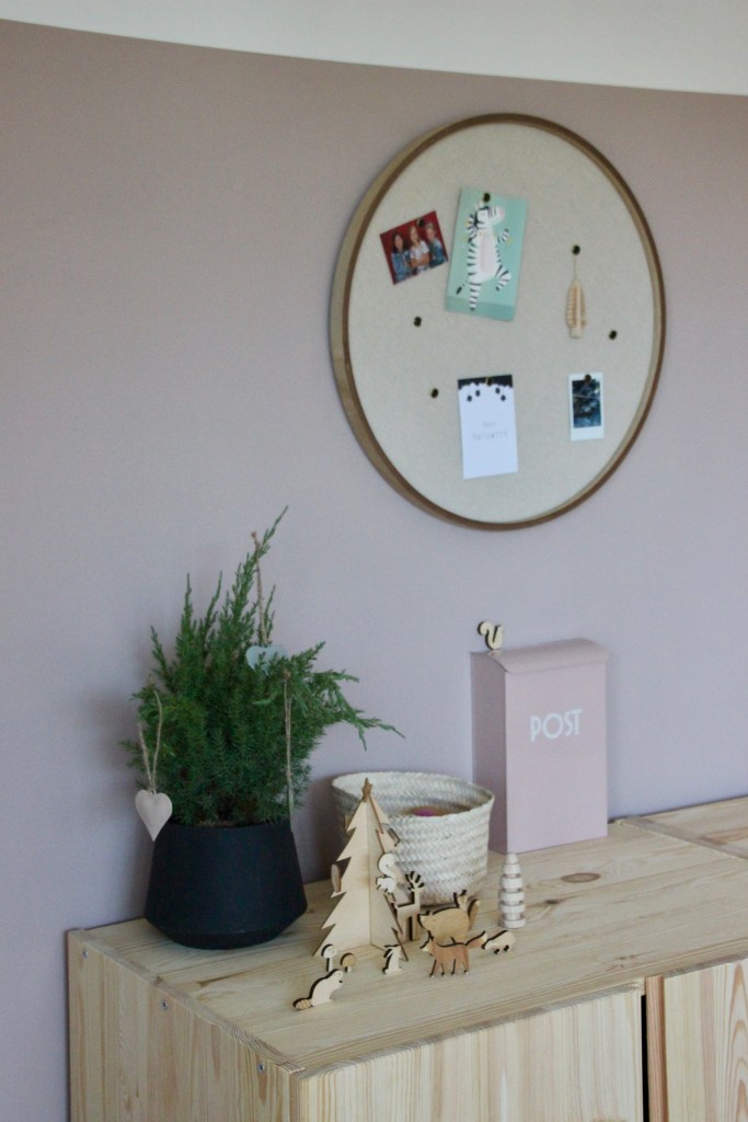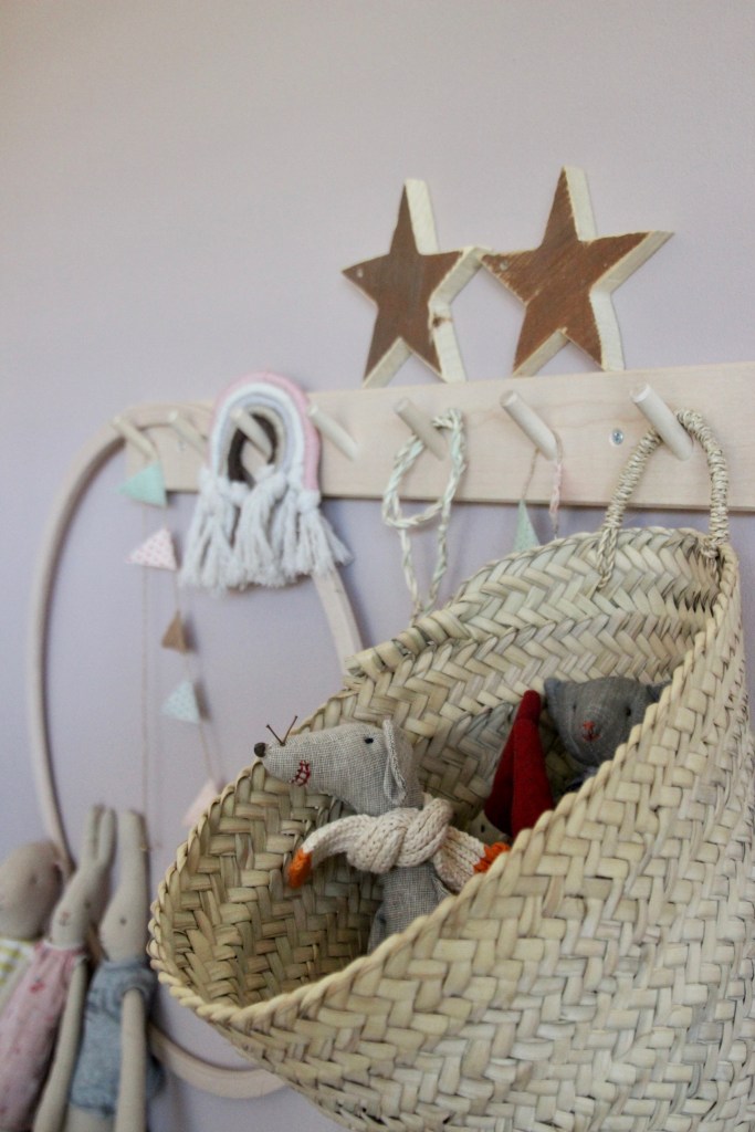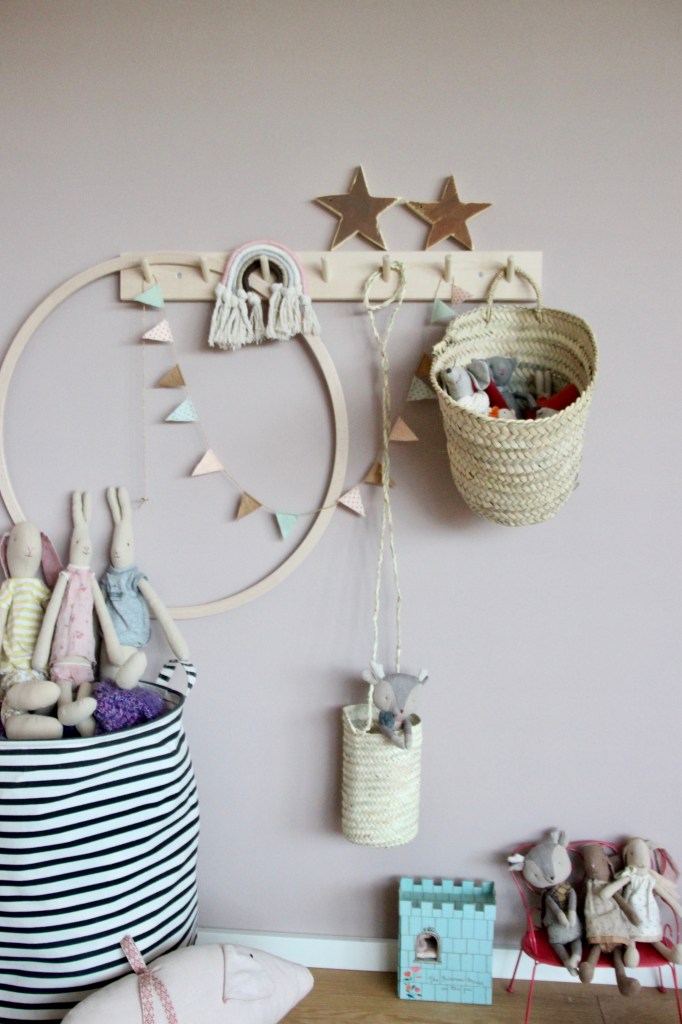 Neben all den Farben gibt es viel Holz. Zwei IVAR Kommoden von IKEA bieten nun Platz für Schulsachen, Spielzeug, Bücher etc. Schon immer wollte ich eine Hakenleiste aus Holz haben, aber es fehlte der Platz. Endlich durfte eine Holzleiste in das Zimmer meiner Tochter einziehen. Hier hängen jetzt Körbe und ein bisschen Deko und verschönern die Wand. Die Körbe bieten auch nochmal Stauraum, z.B. für Kuscheltiere.