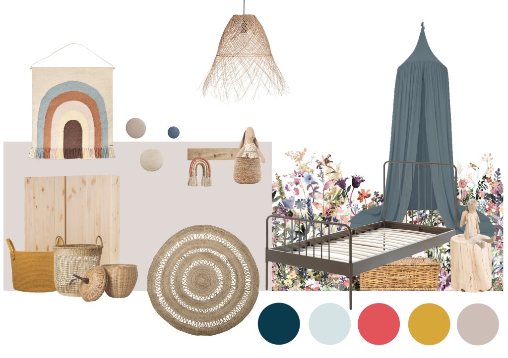 Ich habe mich erst einmal an ein Moodboard gemacht. Das kann ich immer sehr empfehlen, da man alle Ideen und Inspirationen zu einem Projekt sammeln kann. Die Farben hat mir meine Tochter vorgegeben. Ihre Lieblingsfarben sind aktuell Blau und Altrosa, in Kombination mit Braun und Senfgelb. Wichtig war ihr auch ein Betthimmel in Blau. Somit war mein Moodboard recht schnell fertig. Kombinieren wollte ich es mit viel Holz.