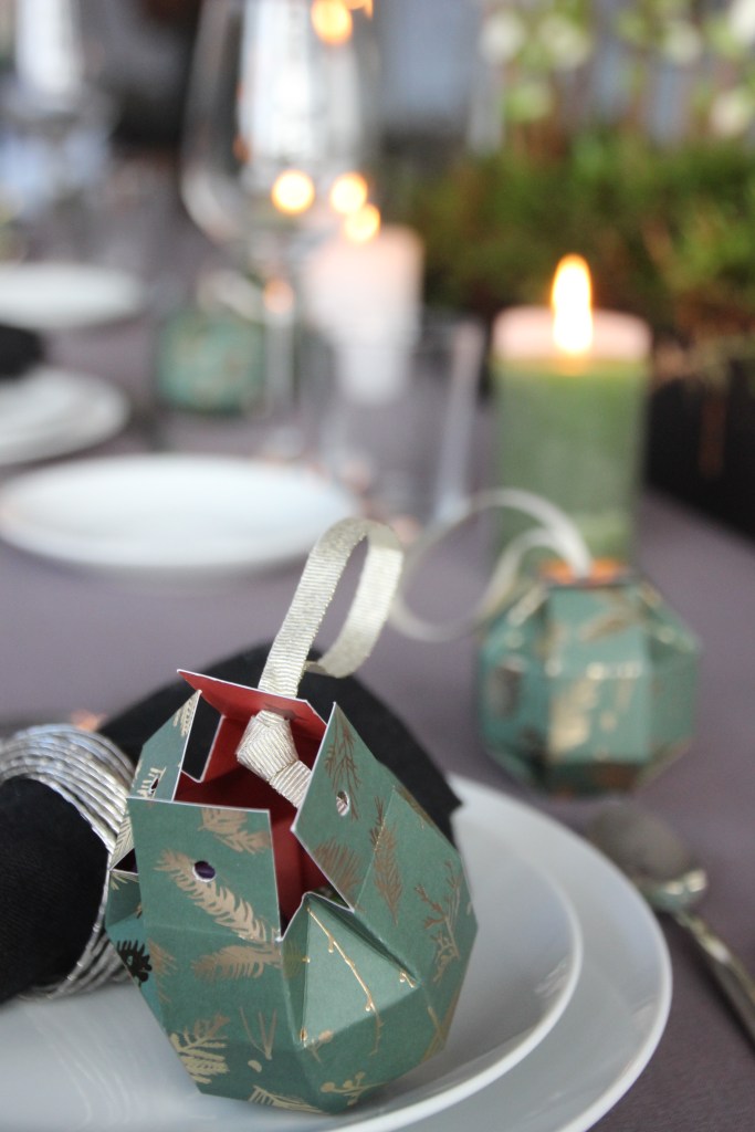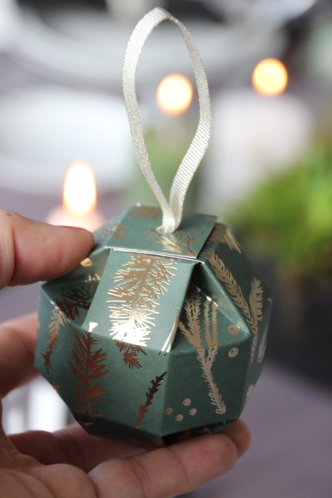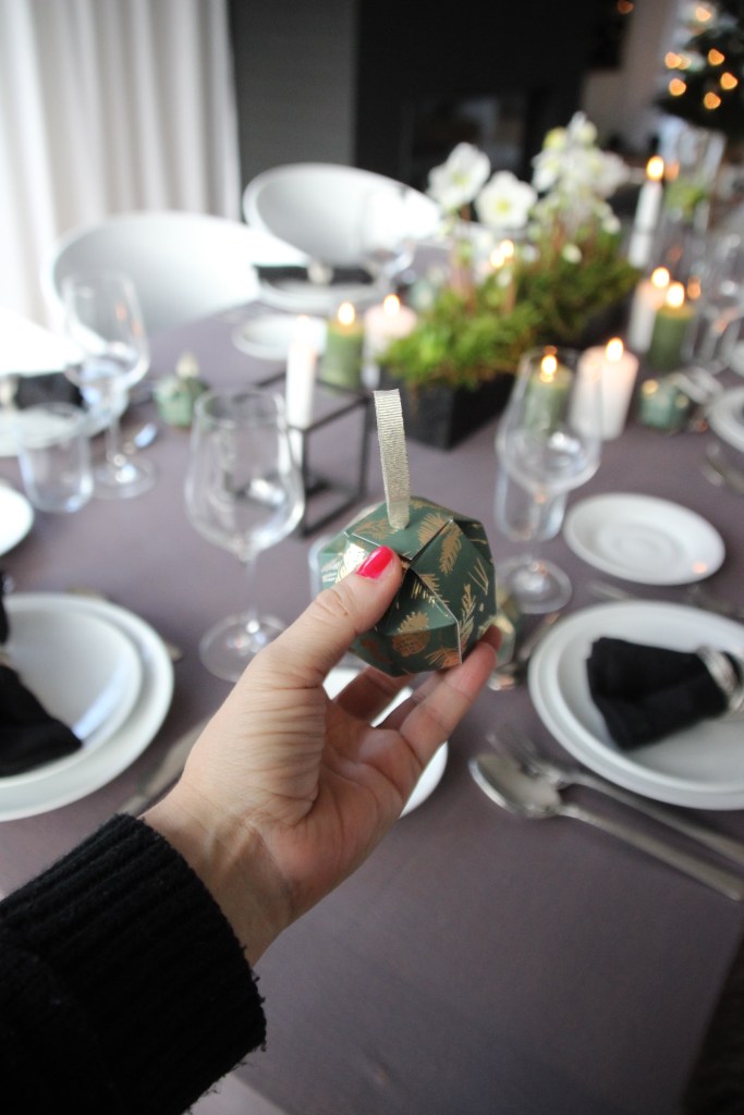 Wie jedes Jahr gibt es bei uns an Heilig Abend ein 3 Gänge Menü und eine passende Tischdeko dazu. Und was natürlich auch nicht fehlen darf – etwas kleines, selbstgebasteltes für die Gäste zum Mitnehmen. Dieses Jahr habe ich mich für Facetten-Kugeln entschieden, die ich dann mit etwas Schokolade gefüllt habe. Eine ausführliche Bastelanleitung findet ihr auf YouTube.