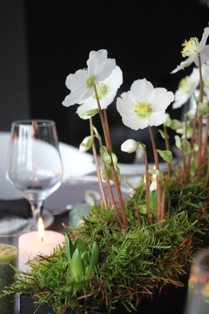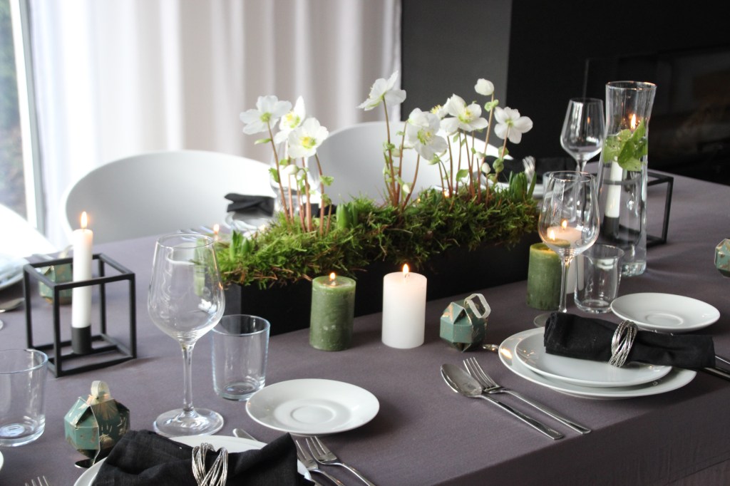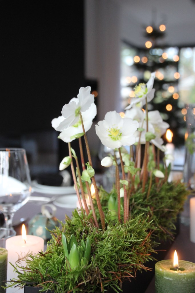 Unsere Tischdeko war, im Gegensatz zum letzten Jahr, recht schlicht gehalten. In der Mitte befand sich ein langes Pflanzgefäß, welches wir mit Christrosen, Hyazinthen und Moos bestückt haben. Grüne und weiße Kerzen und zwei Kerzenständer haben für die nötige Gemütlichkeit gesorgt. Zusätzlich hat jeder Gast meine gebastelte Facetten-Kugel als Mitgebsel erhalten.