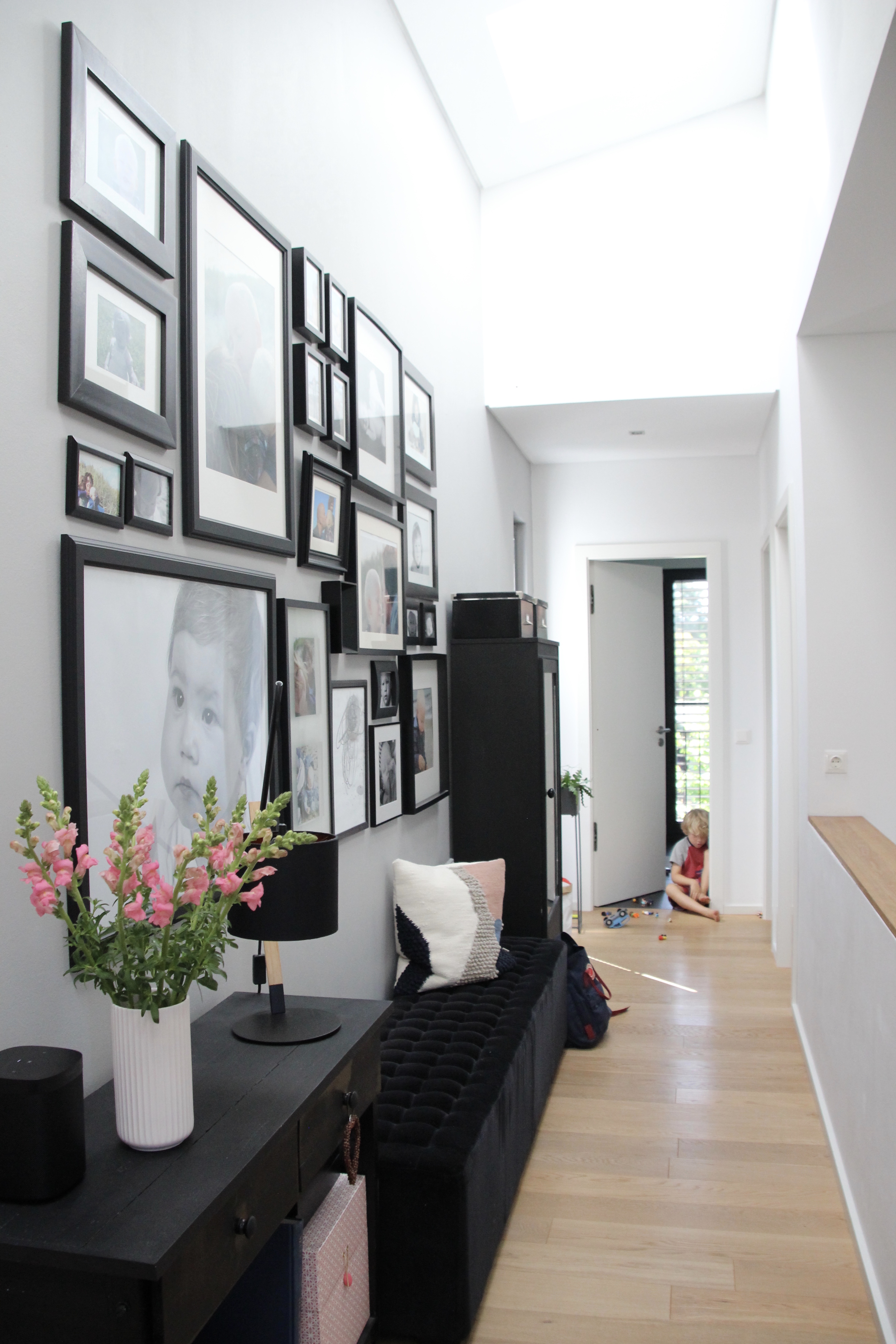 Bisher standen an der hohen Wand im Flur eine schwarze Sitzbank und ein kleiner Bücherschrank. Zusätzlich verzierte diese Wand eine riesige Bildergalerie mit Familienfotos. Über die Jahre ist es mir zu unruhig geworden und ich wollte mehr Leichtigkeit und Gemütlichkeit in den Flur bekommen.