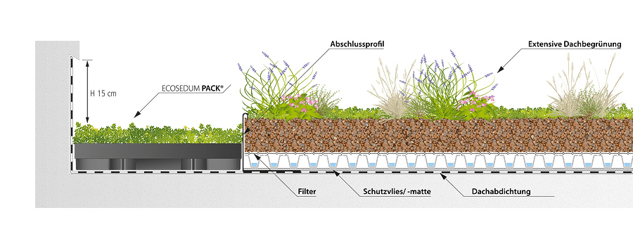 Zusätzlich verfügt das ECOSEDUM® PACK über eine integrierte Drainage, groß genug für Starkregenereignisse und schmal genug, um Fremdbewuchs durch anfliegende Baumsamen zu vermeiden. Das Video zeigt sehr schön, wie die integrierte Drainage funktioniert.