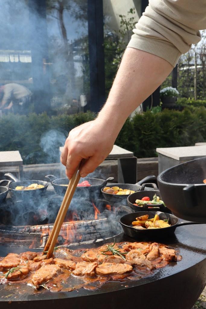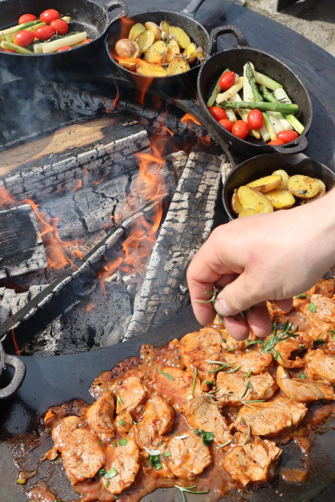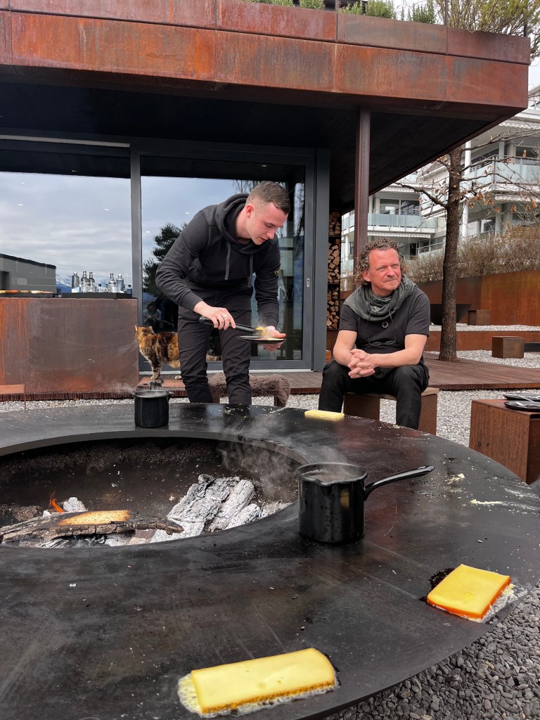 Was sollen wir sagen, wir waren sofort begeistert. Es war wie Liebe auf den ersten Blick. Wir trafen gegen Mittag in Immensee ein, zu der Zeit saßen Beate und Andreas mit ihren Kolleg:innen an einem riesigen Feuerring und grillierten Grillkäse. Dazu gab es Pellkartoffeln, gekocht in einem kleinen Stövchen auf dem Feuerring. Wir durften uns direkt dazu gesellen und mitessen und bekamen also einen ersten Eindruck vom Grillieren am Feuerring.