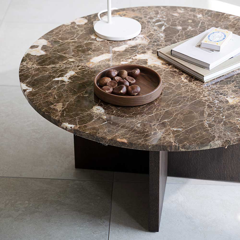 Ein Wohnzimmer im Mocha-Mousse-Look braucht einen Couchtisch, der Stil und Funktionalität vereint. Der Marmor Couchtisch „Apulco“ ist die perfekte Wahl. Die edle Braun marmorierte Steinplatte aus echtem Marmor (brauner Emperador) bringt einen Hauch von Luxus und Eleganz in dein Wohnzimmer. Das Tischgestell aus braunem Eichenfurnier setzt einen modernen Kontrast, der das Gesamtbild auflockert und wunderbar mit der Wärme von Mocha Mousse harmoniert. Trotz seines minimalistischen Designs bietet der Tisch eine stabile und praktische Ablagefläche für Bücher, Kerzen oder deinen Nachmittagskaffee.