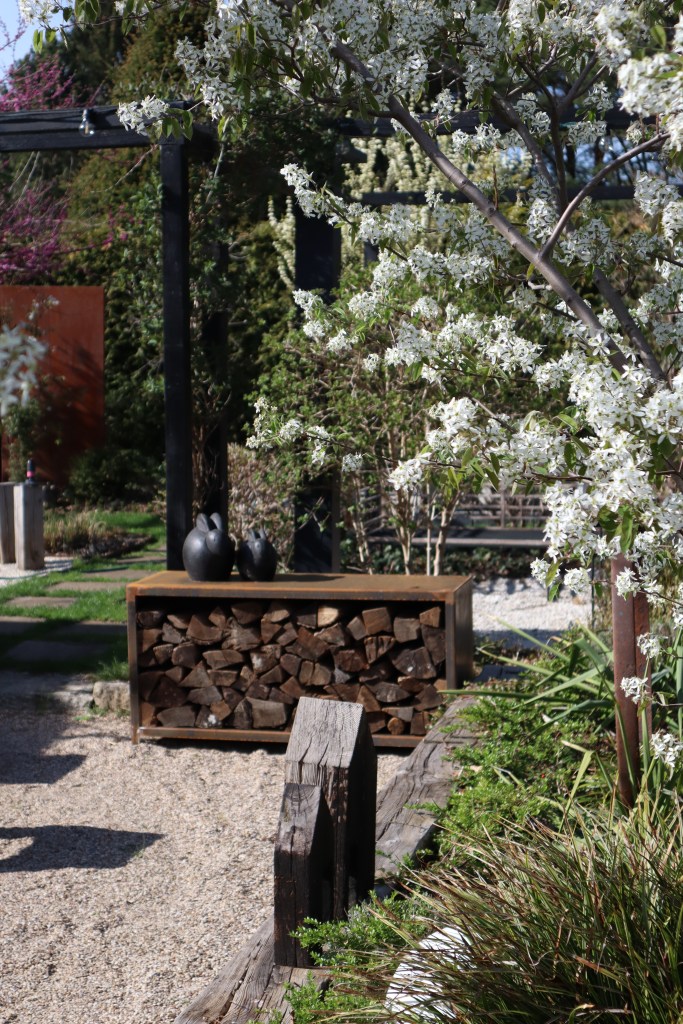 Ein weiteres Highlight ist das Brennholzregal aus Cortenstahl mit den Maßen 120x40x60cm, welches wir seitlich im Senkgarten platziert haben. Es dient als elegante und wetterfeste Aufbewahrung für unser Brennholz und als Ablage für Grillutensilien und Lebensmittel, wenn wir an unserem Feuerring grillieren – gleichzeitig fügt es sich durch Material und Form perfekt in das Gesamtbild ein.