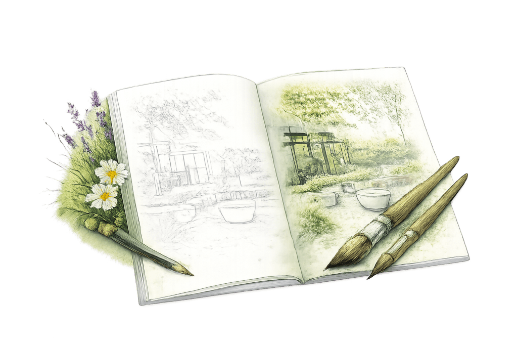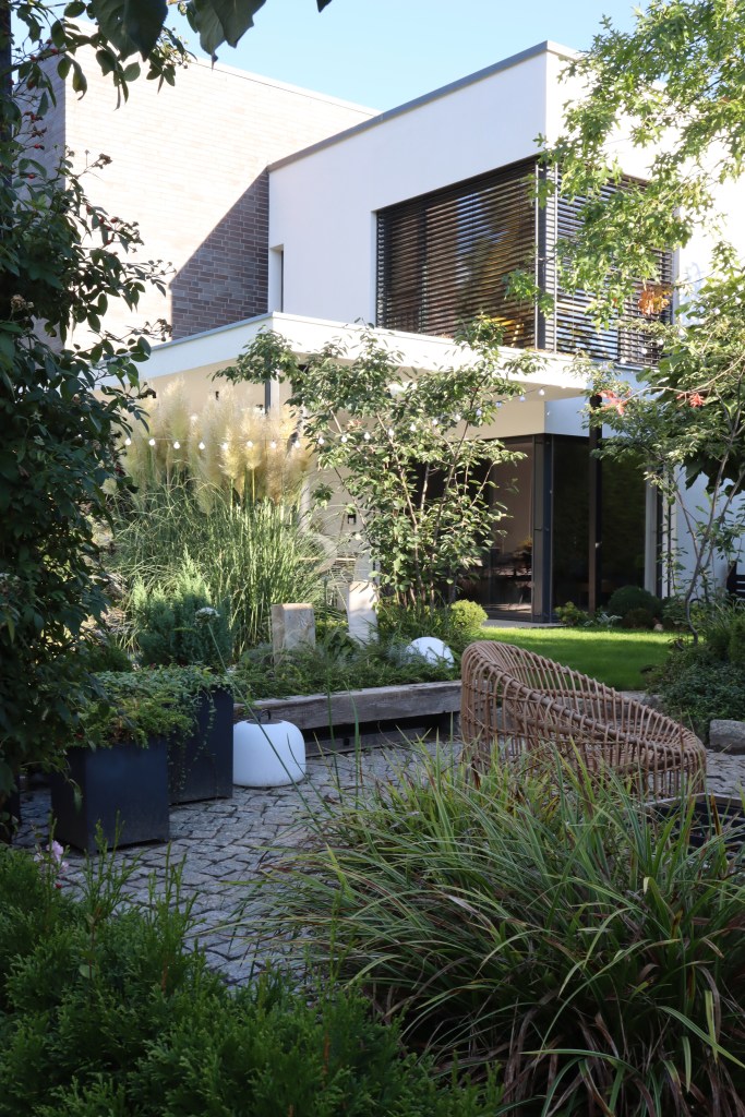 Unser Garten, den mein Mann Sebastian über Jahre hinweg geplant, gestaltet und immer weiterentwickelt hat, ist kein abgeschlossenes Projekt. Er verändert sich mit den Jahreszeiten, mit Licht, Pflanzen, Materialien. Genau diese ruhige, klare Atmosphäre war der Ausgangspunkt für die Idee, daraus ein Malbuch für Erwachsene zu machen.